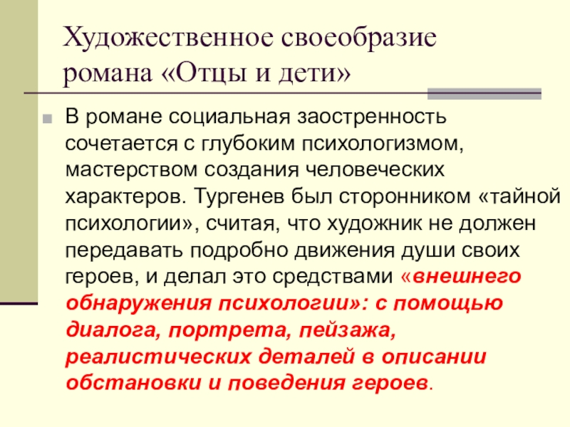глубоким психологизмом, мастерством создания человеческих характеров. Тургенев был сторонником «тайной психологии», считая, что художник не должен передавать подробно движения души своих героев, и делал это средствами «внешнего обнаружения психологии»: с помощью диалога, портрета, пейзажа, реалистических деталей в описании обстановки и поведения героев.