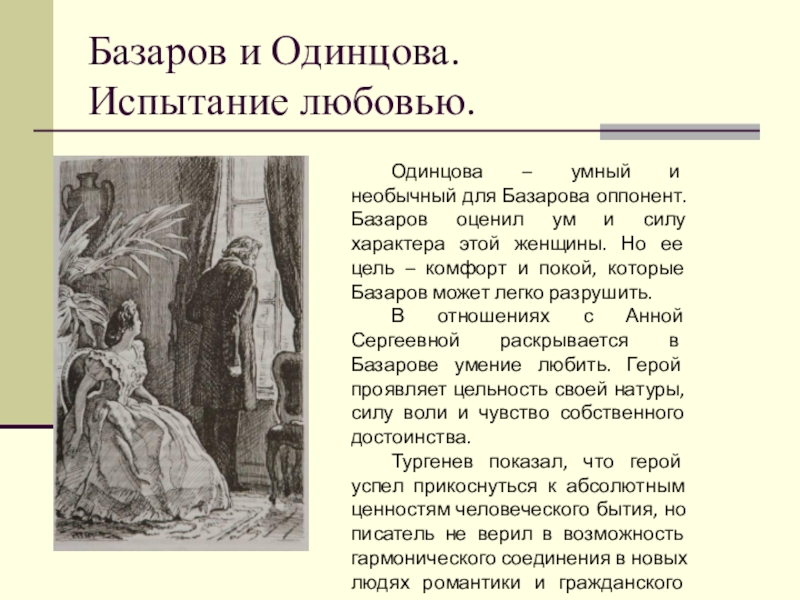 В отношениях с Анной Сергеевной раскрывается в Базарове умение любить. Герой проявляет цельность своей натуры, силу воли и чувство собственного достоинства.