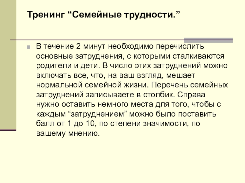 которыми сталкиваются родители и дети. В число этих затруднений можно включать все, что, на ваш взгляд, мешает нормальной семейной жизни. Перечень семейных затруднений записываете в столбик. Справа нужно оставить немного места для того, чтобы с каждым “затруднением” можно было поставить балл от 1 до 10, по степени значимости, по вашему мнению.