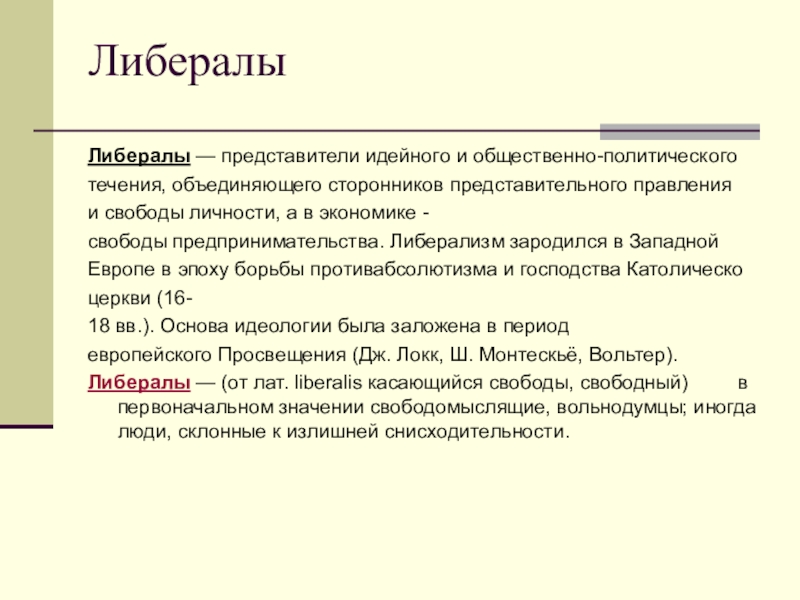Либералы — (от лат. liberalis касающийся свободы, свободный) в первоначальном значении свободомыслящие,