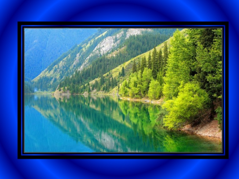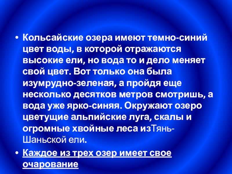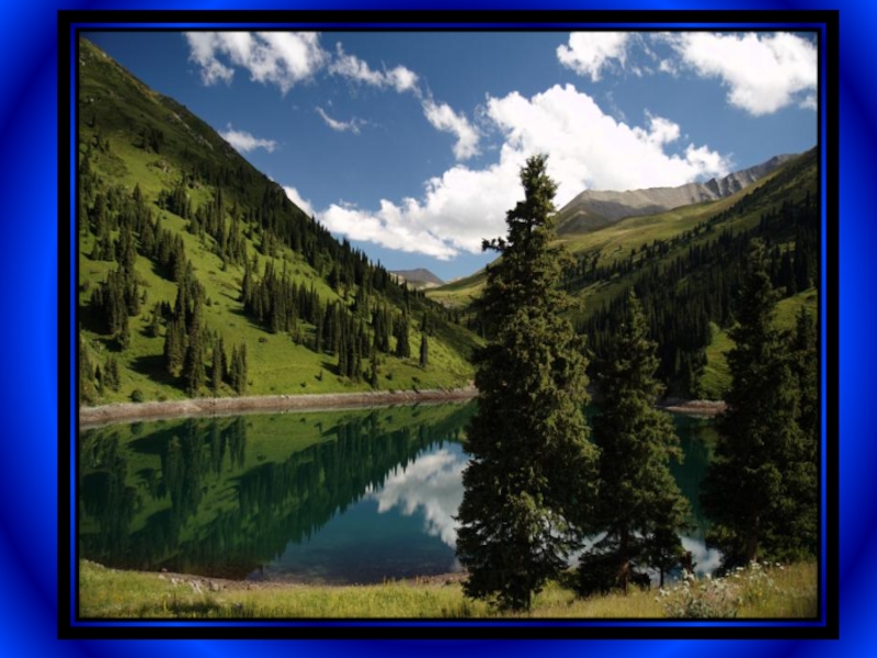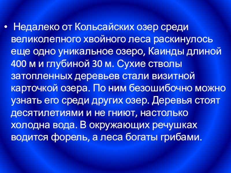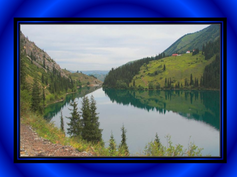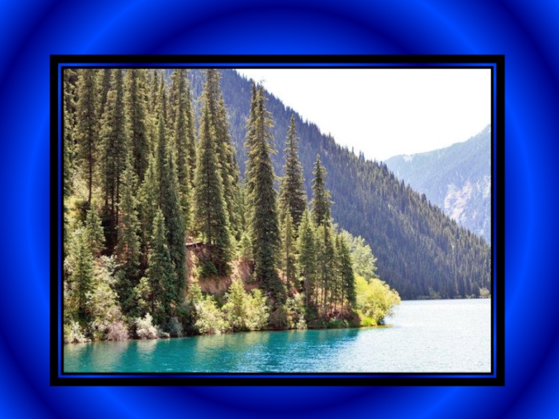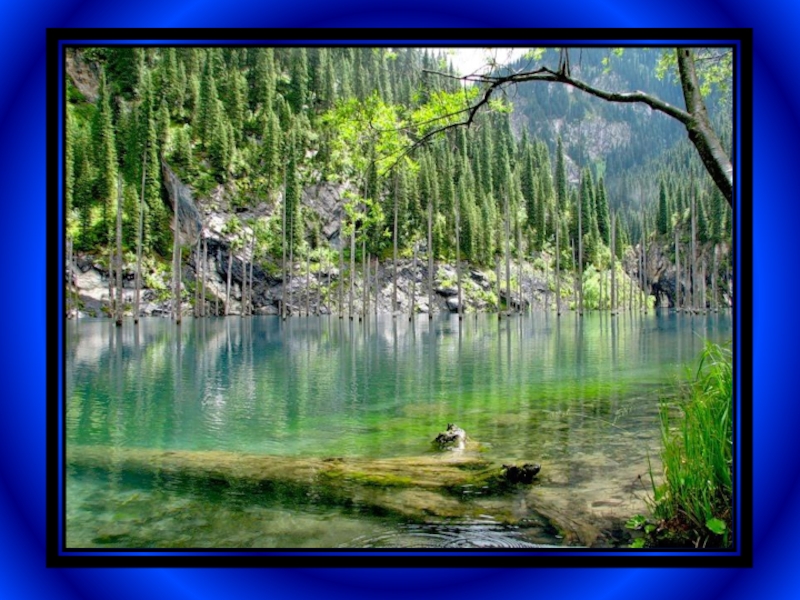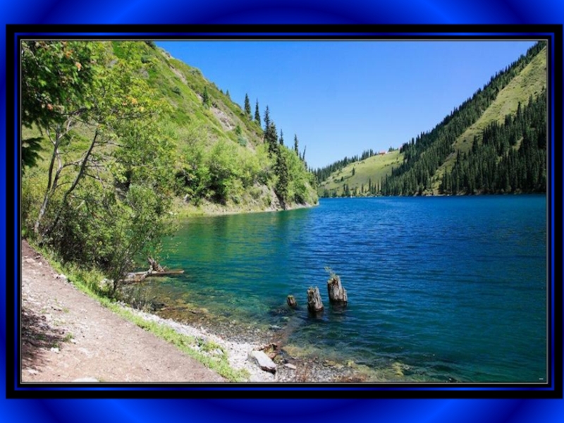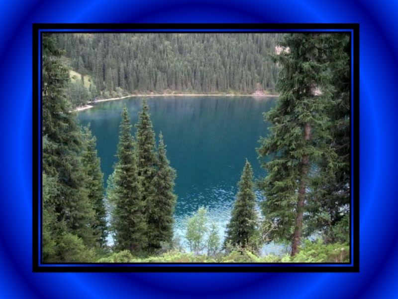 Слайд 22Кольсайские озера имеют темно-синий цвет воды, в которой отражаются высокие ели, но