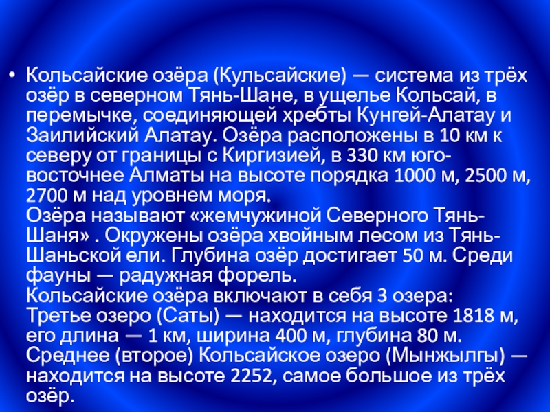 Слайд 5Кольсайские озёра (Кульсайские) — система из трёх озёр в северном Тянь-Шане,