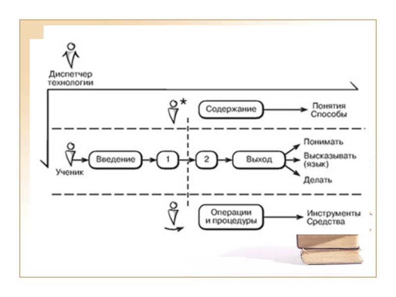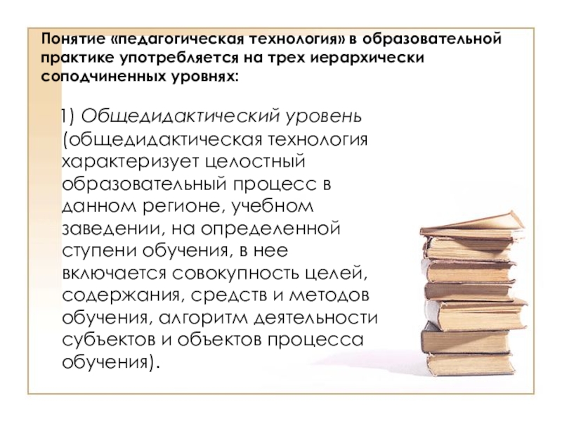 1) Общедидактический уровень (общедидактическая технология характеризует целостный образовательный процесс в данном регионе, учебном заведении, на определенной ступени обучения, в нее включается совокупность целей, содержания, средств и методов обучения, алгоритм деятельности субъектов и объектов процесса обучения).