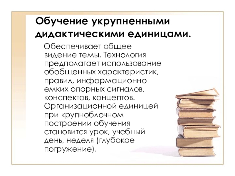 использование обобщенных характеристик, правил, информационно емких опорных сигналов, конспектов, концептов. Организационной единицей при крупноблочном построении обучения становится урок, учебный день, неделя (глубокое погружение).