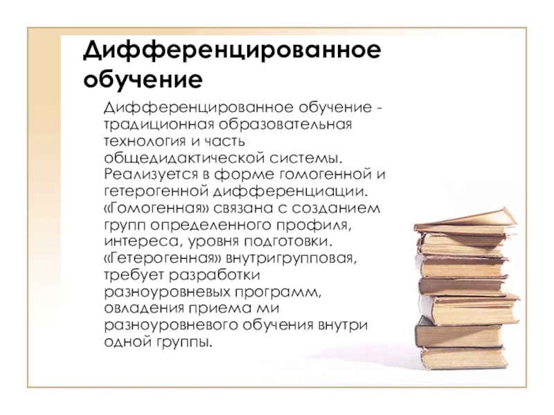 часть общедидактической системы. Реализуется в форме гомогенной и гетерогенной дифференциации. «Гомогенная» связана с созданием групп определенного профиля, интереса, уровня подготовки. «Гетерогенная» внутригрупповая, требует разработки разноуровневых программ, овладения приема ми разноуровневого обучения внутри одной группы.