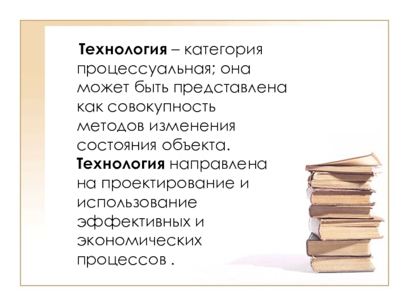 совокупность методов изменения состояния объекта. Технология направлена на проектирование и использование эффективных и экономических процессов .