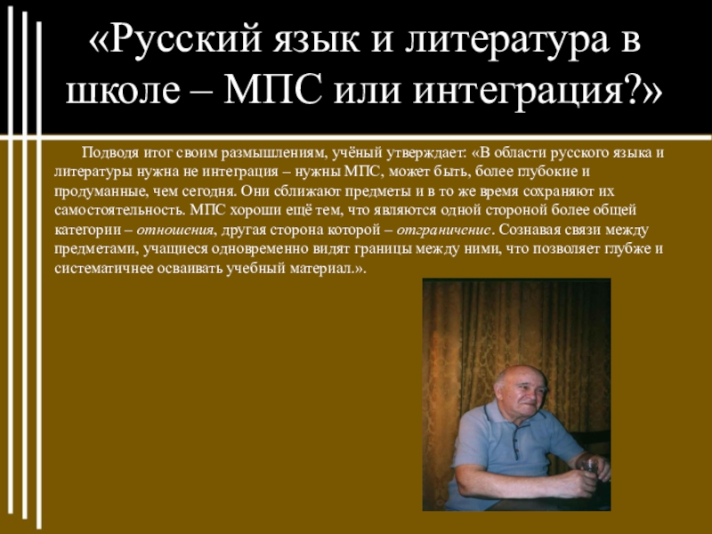 Подводя итог своим размышлениям, учёный утверждает: «В области русского языка и литературы нужна не интеграция – нужны МПС, может быть, более глубокие и продуманные, чем сегодня. Они сближают предметы и в то же время сохраняют их самостоятельность. МПС хороши ещё тем, что являются одной стороной более общей категории – отношения, другая сторона которой – отграничение. Сознавая связи между предметами, учащиеся одновременно видят границы между ними, что позволяет глубже и систематичнее осваивать учебный материал.».