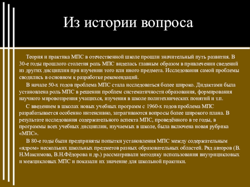 школе прошли значительный путь развития. В 30-е годы прошлого столетия роль МПС виделась главным образом в привлечении сведений из других дисциплин при изучении того или иного предмета. Исследования самой проблемы сводились в основном к разработке рекомендаций.
