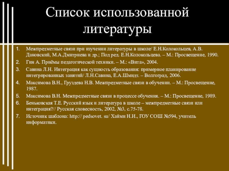 Максимова В.Н. Межпредметные связи в процессе обучения. – М.: Просвещение, 1989.