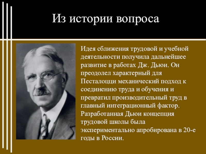 получила дальнейшее развитие в работах Дж. Дьюи. Он преодолел характерный для Песталоцци механический подход к соединению труда и обучения и превратил производительный труд в главный интеграционный фактор. Разработанная Дьюи концепция трудовой школы была экспериментально апробирована в 20-е годы в России.