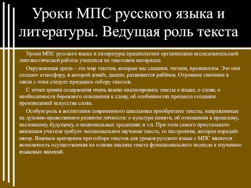 Уроки МПС русского языка и литературы предполагают организацию исследовательской лингвистической работы учащихся на текстовом материале.