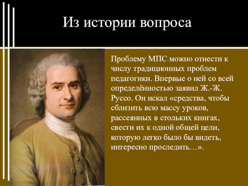 проблем педагогики. Впервые о ней со всей определённостью заявил Ж.-Ж.Руссо. Он искал «средства, чтобы сблизить всю массу уроков, рассеянных в стольких книгах, свести их к одной общей цели, которую легко было бы видеть, интересно проследить…».