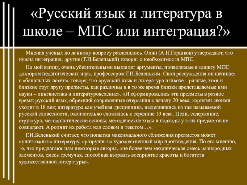 На мой взгляд, очень убедительными выглядят аргументы, приводимые в защиту МПС доктором педагогических наук, профессором Г.И.Беленьким. Свои рассуждения он начинает с «банальных истин», говоря, что «русский язык и литература в школе – разные, хотя и близкие друг другу предметы, как различны и в то же время близки представляемые ими науки – лингвистика и литературоведение». «И сформировались эти предметы в разное время: русский язык, обретший современные очертания к началу 20 века, корнями своими уходит в 18 век; литература как учебная дисциплина, выделившись из так называемой русской словесности, окончательно сложилась к середине 19 века. Цели, содержание, структура, методологические основы, методические ходы и подходы у этих предметов не совпадают. А роднит их работа над словом и текстом…».
