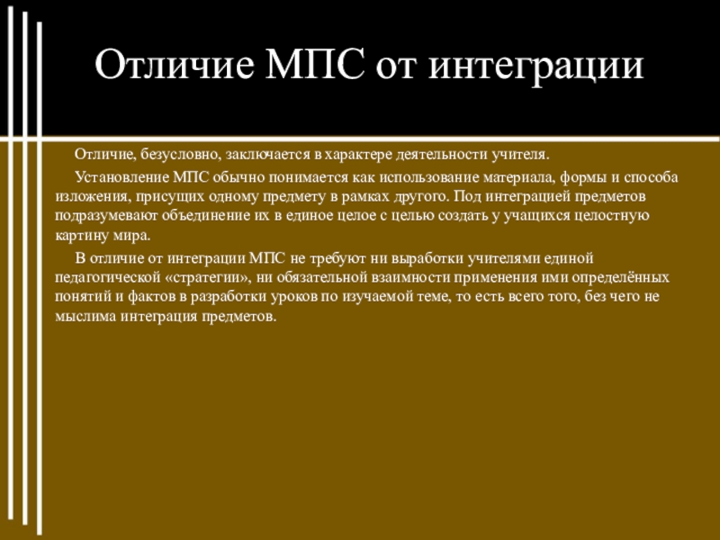 В отличие от интеграции МПС не требуют ни выработки учителями единой педагогической «стратегии», ни обязательной взаимности применения ими определённых понятий и фактов в разработки уроков по изучаемой теме, то есть всего того, без чего не мыслима интеграция предметов.