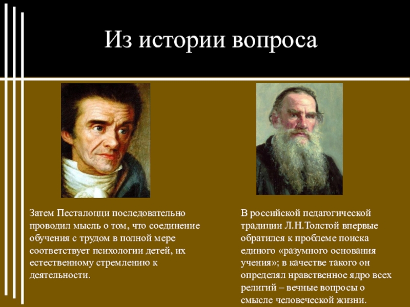 В российской педагогической традиции Л.Н.Толстой впервые обратился к проблеме поиска единого «разумного основания учения»; в качестве такого он определял нравственное ядро всех религий – вечные вопросы о смысле человеческой жизни.