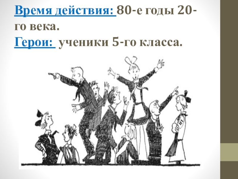 Слайд 15Время действия: 80-е годы 20-го века. Герои: ученики 5-го класса.