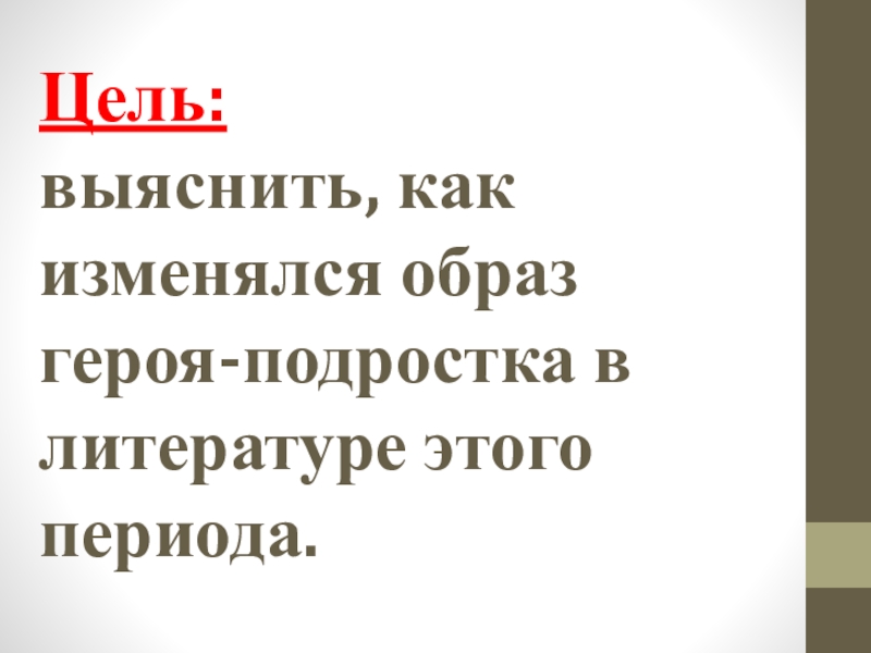 Слайд 4 Цель: выяснить, как изменялся образ героя-подростка в литературе этого периода.