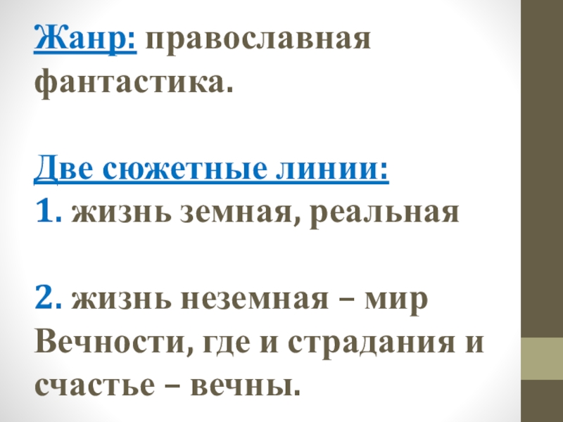 Слайд 25Жанр: православная фантастика. Две сюжетные линии: 1. жизнь земная, реальная 2. жизнь неземная –
