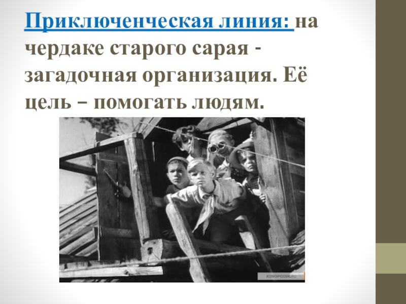 Слайд 13Приключенческая линия: на чердаке старого сарая -загадочная организация. Её цель –