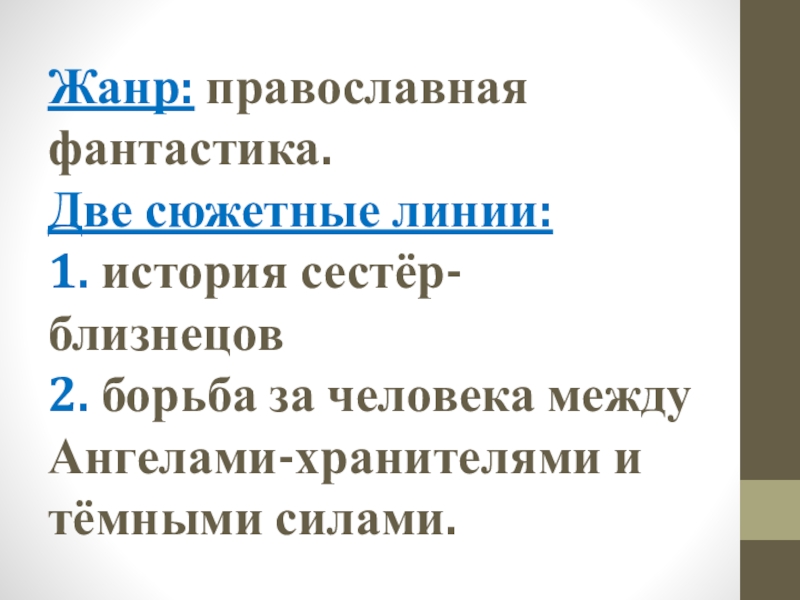 Слайд 23Жанр: православная фантастика. Две сюжетные линии: 1. история сестёр-близнецов 2. борьба за человека между