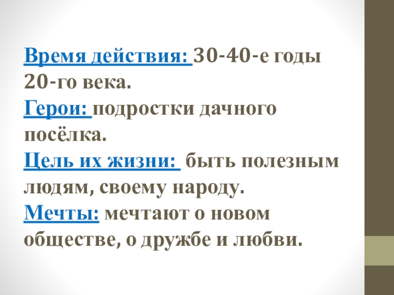 Слайд 12Время действия: 30-40-е годы 20-го века. Герои: подростки дачного посёлка. Цель их жизни: