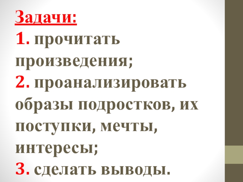 Слайд 5Задачи: 1. прочитать произведения; 2. проанализировать образы подростков, их поступки, мечты, интересы; 3. сделать