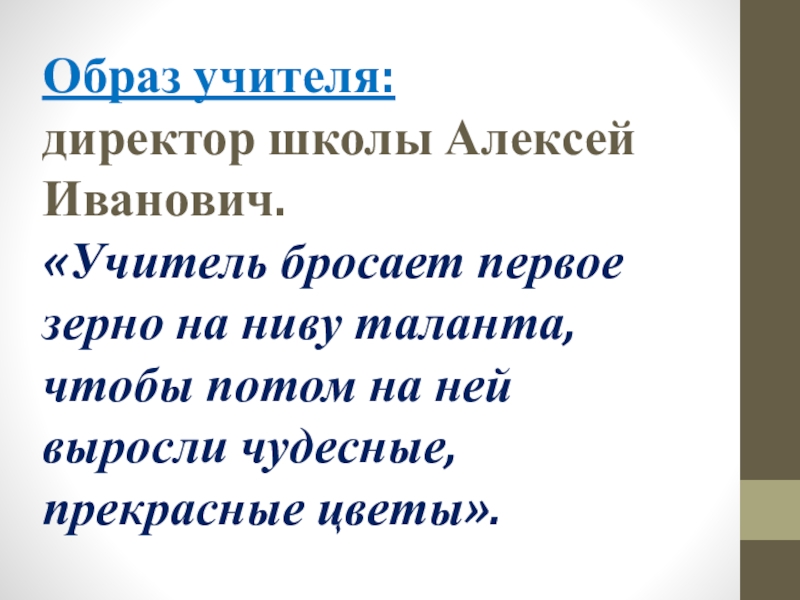 Слайд 10Образ учителя: директор школы Алексей Иванович. «Учитель бросает первое зерно на ниву таланта,