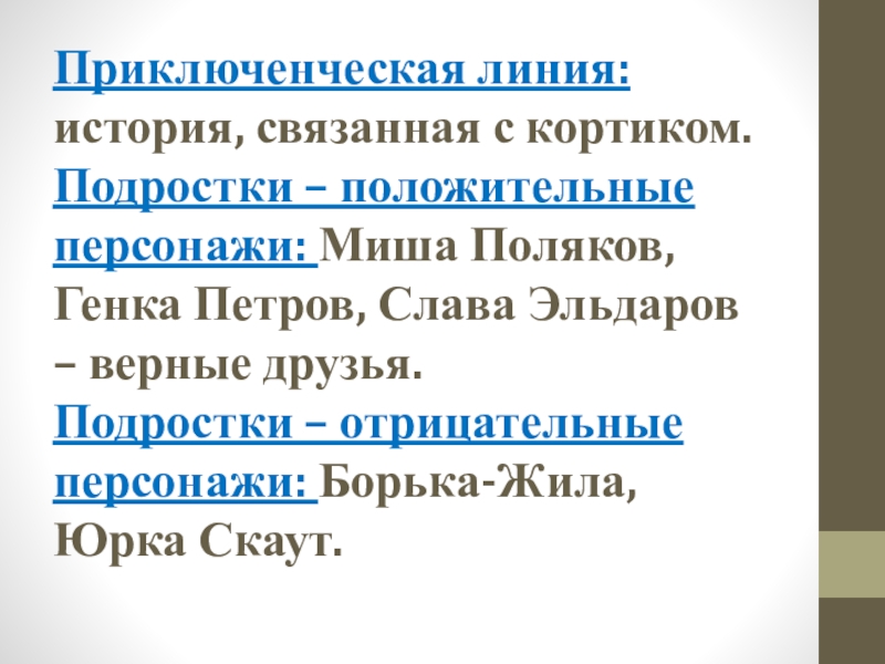 Слайд 9 Приключенческая линия: история, связанная с кортиком. Подростки – положительные персонажи: Миша Поляков,