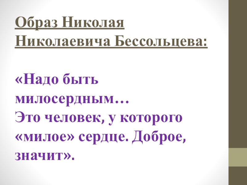 Образ Николая Николаевича Бессольцева:  «Надо быть милосердным… Это человек, у которого «милое» сердце. Доброе, значит».