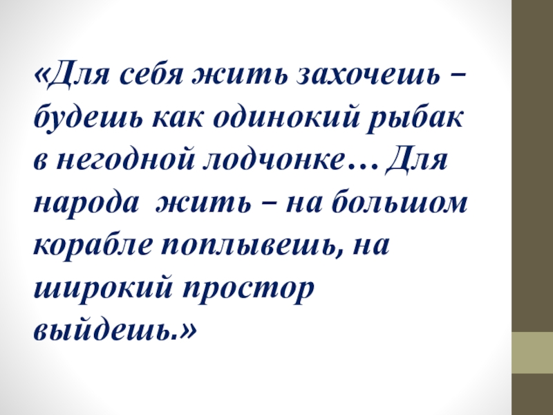 «Для себя жить захочешь – будешь как одинокий рыбак в негодной лодчонке… Для народа жить – на