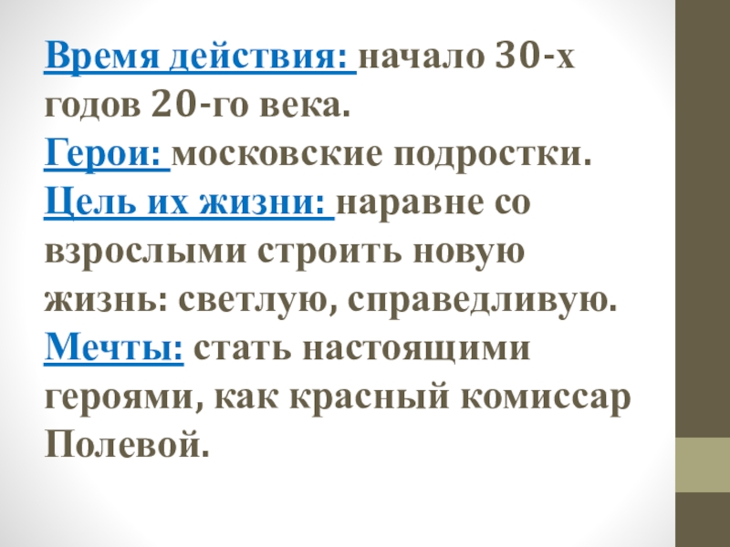 Слайд 7Время действия: начало 30-х годов 20-го века. Герои: московские подростки. Цель их жизни: