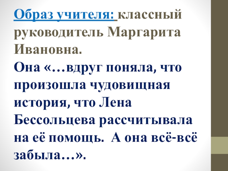 Образ учителя: классный руководитель Маргарита Ивановна. Она «…вдруг поняла, что произошла чудовищная история, что Лена Бессольцева рассчитывала