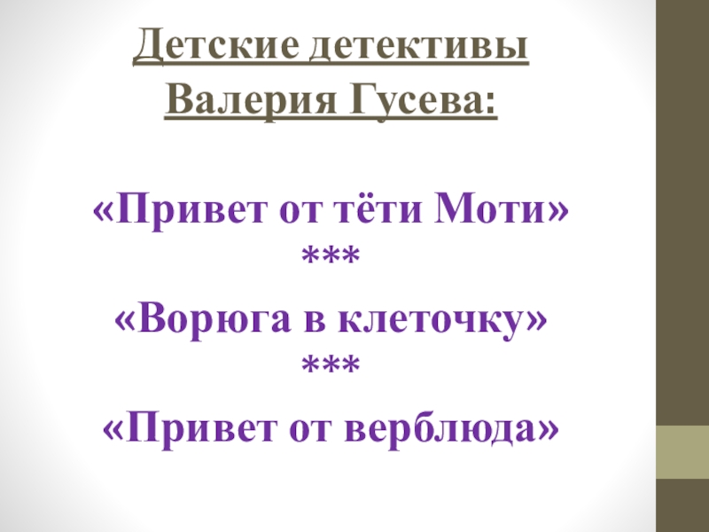 Слайд 21Детские детективы Валерия Гусева: «Привет от тёти Моти» *** «Ворюга в клеточку» *** «Привет от