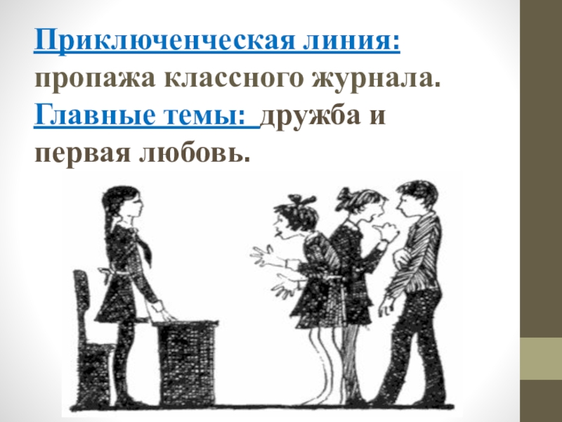 Слайд 16Приключенческая линия: пропажа классного журнала. Главные темы: дружба и первая любовь.