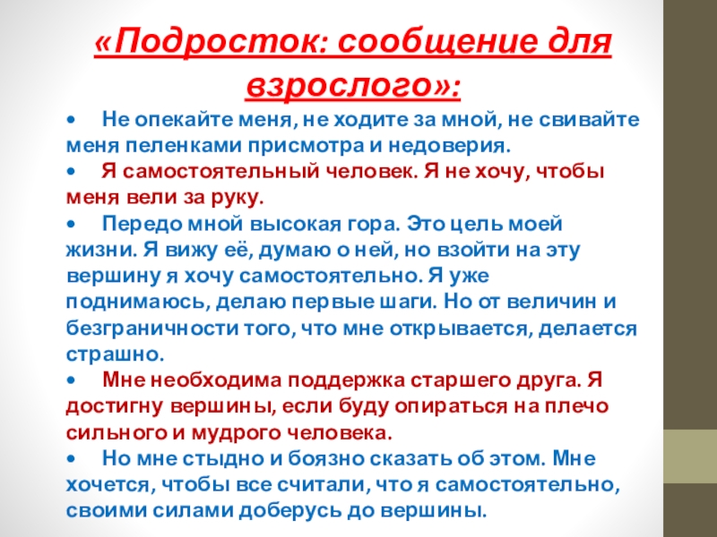 «Подросток: сообщение для взрослого»: •	Не опекайте меня, не ходите за мной, не свивайте меня пеленками присмотра и