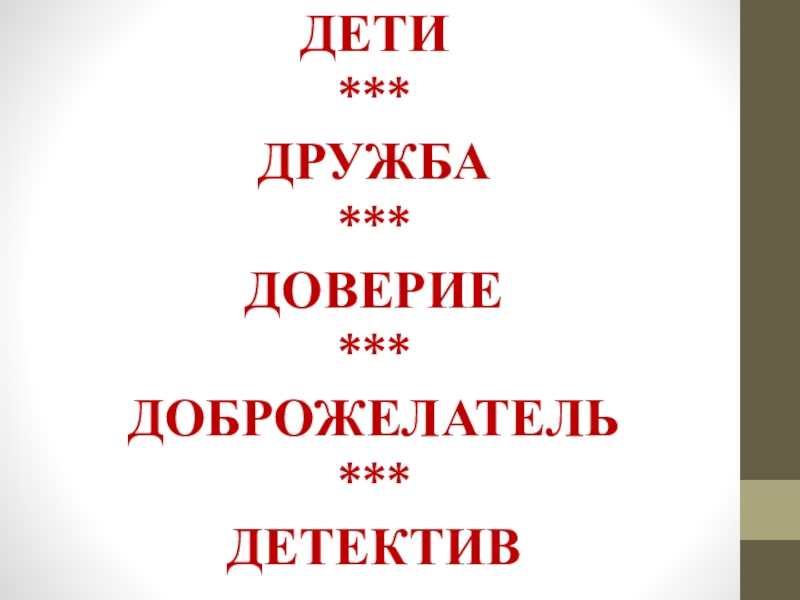 Слайд 26 ДЕТИ *** ДРУЖБА *** ДОВЕРИЕ *** ДОБРОЖЕЛАТЕЛЬ *** ДЕТЕКТИВ