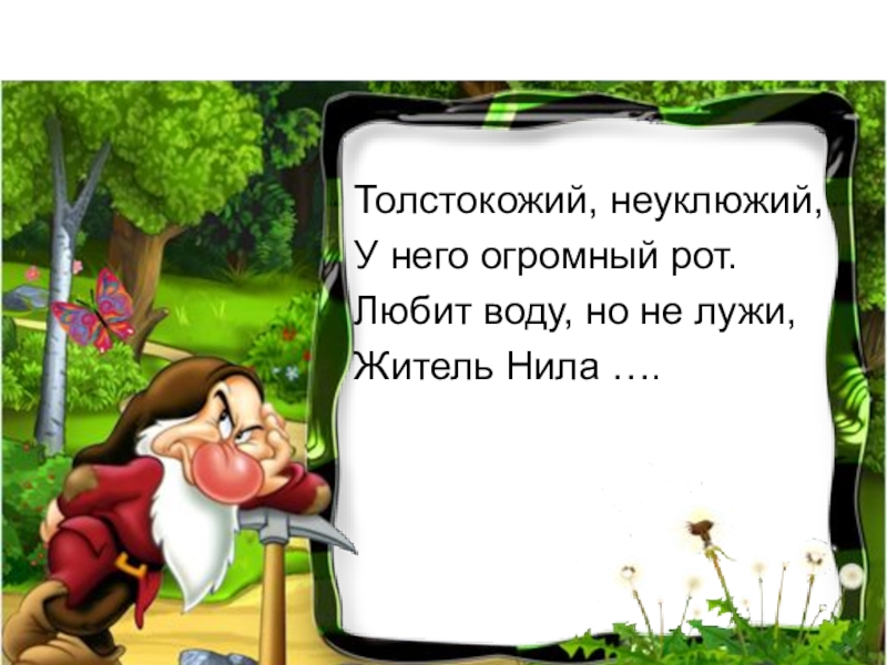 Толстокожий, неуклюжий,У него огромный рот.Любит воду, но не лужи,Житель Нила ….