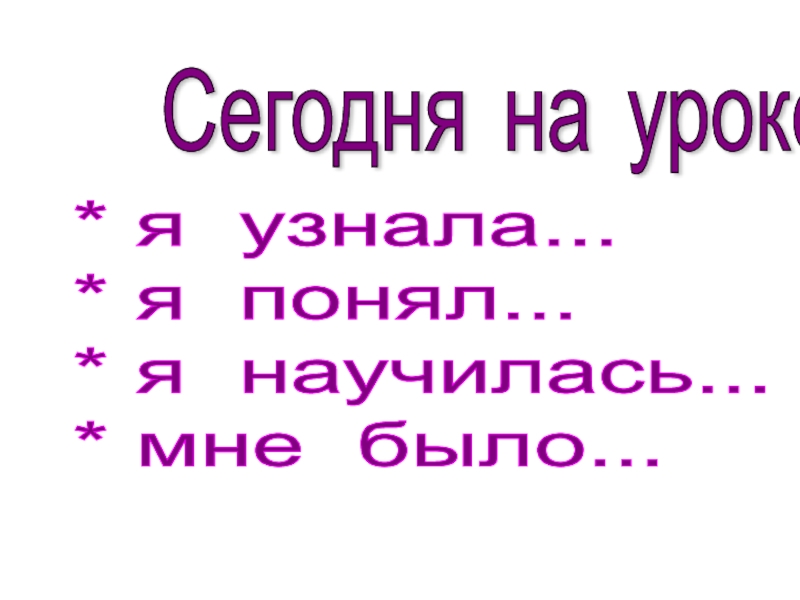 Сегодня на уроке* я узнала...  * я понял...  * я научилась...  * мне было...