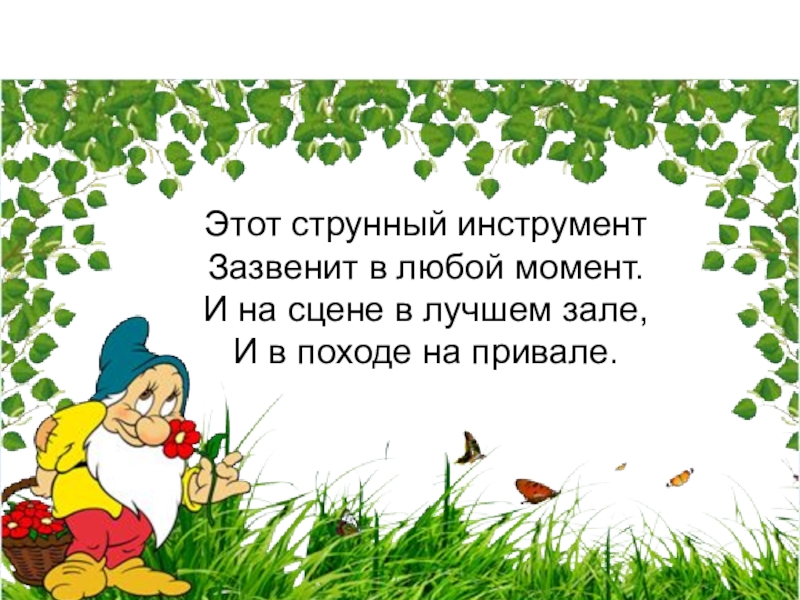 Слайд 12Этот струнный инструмент Зазвенит в любой момент. И на сцене в лучшем зале, И