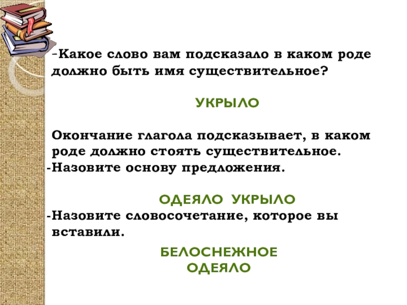 Слайд 25-Какое слово вам подсказало в каком роде должно быть имя существительное?