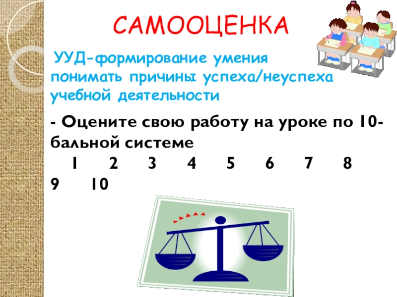 Предметные УУД : предлагает вспомнить критерии оценивания, дает время для самооценки, выслушивает результаты.