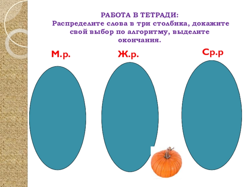 Учащиеся распределяют слова в три столбика, работают вслух, доказывая свой выбор по алгоритму, выделяют окончания. Обращают внимание на окончания существительных ср.р.