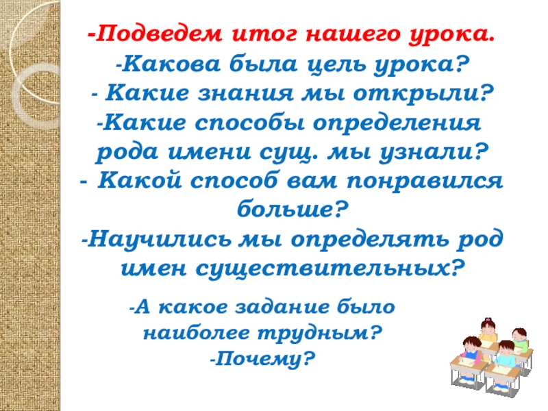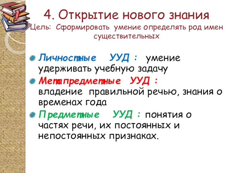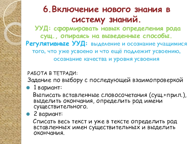УУД: сформировать навык определения рода сущ., опираясь на выведенные способы.