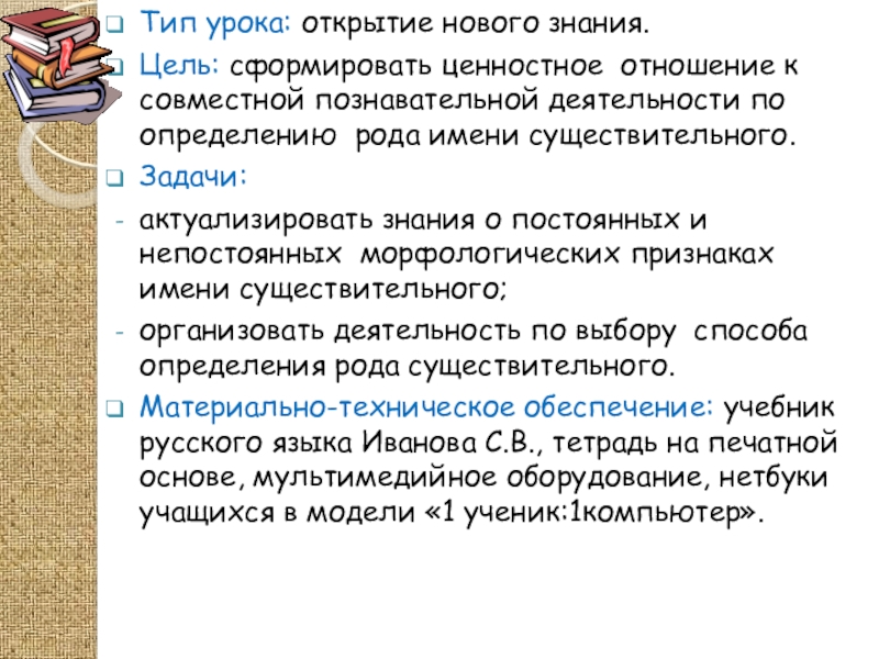 Материально-техническое обеспечение: учебник русского языка Иванова С.В., тетрадь на печатной основе, мультимедийное оборудование, нетбуки учащихся в модели «1 ученик:1компьютер».