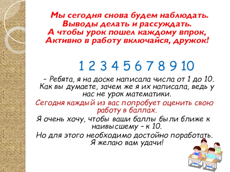 - Ребята, я на доске написала числа от 1 до 10. Как вы думаете, зачем же я их написала, ведь у нас не урок математики.