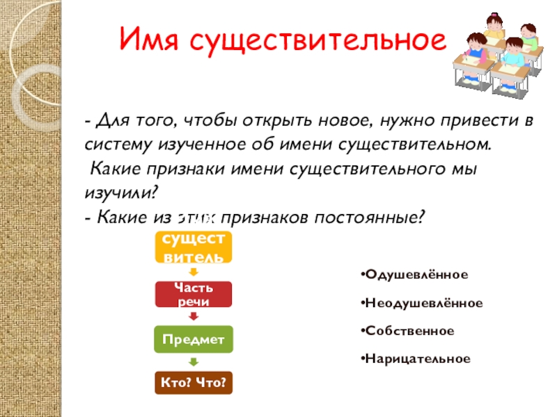 актуализировать знания о постоянных и непостоянных морфологических признаках имени существительного;
