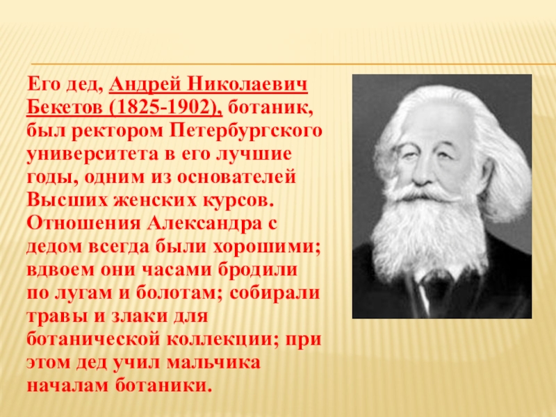 Слайд 3 Его дед, Андрей Николаевич Бекетов (1825-1902), ботаник, был ректором