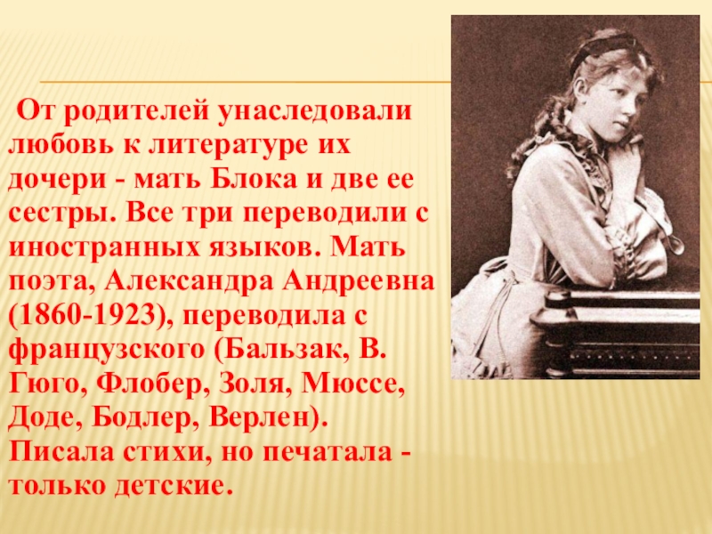 - мать Блока и две ее сестры. Все три переводили с иностранных языков. Мать поэта, Александра Андреевна (1860-1923), переводила с французского (Бальзак, В.Гюго, Флобер, Золя, Мюссе, Доде, Бодлер, Верлен). Писала стихи, но печатала - только детские.