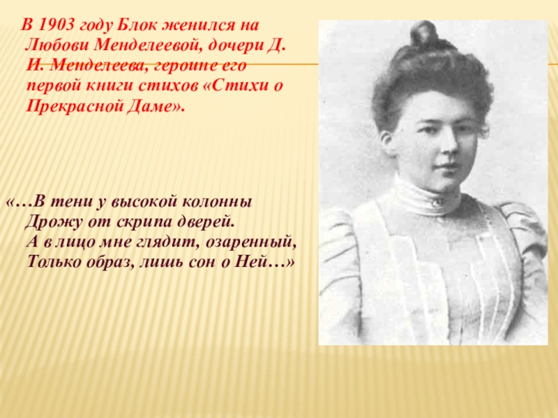 Д. И. Менделеева, героине его первой книги стихов «Стихи о Прекрасной Даме».
