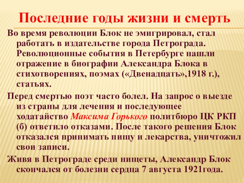 Перед смертью поэт часто болел. На запрос о выезде из страны для лечения и последующее ходатайство Максима Горького политбюро ЦК РКП(б) ответило отказами. После такого решения Блок отказался принимать пищу и лекарства, уничтожил свои записи.